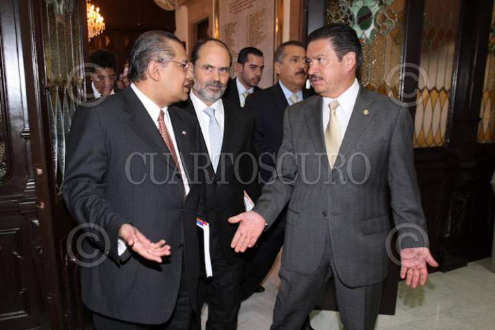 MÉXICO, D.F., 10MARZO2010.- Luis Maldonado, senador del convergencia, conversa con Carlos Navarrete, Presidente de la mesa directiva del senado, mientras que Gustavo Madero, los observa, minutos antes de la conferencia de prensa en la que impulsaran y agilizaran los dictámenes de seguridad publica y justicia y de reglamento para el Gobierno Interior de la Cámara de Senadores para su correspondiente discusión y, en su caso, aprobación. FOTO: CUARTOSCURO.COM