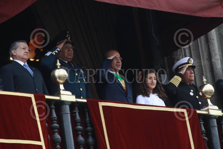 MÉXICO, D.F., 21NOVIEMBRE2009.- Ricardo García Cervantes, Francisco Xavier Salazar, Guillermo Galvan Galvan secretario de la SEDENA, Felipe Calderon Hinojosa Presidente de Mexico, Francisco Saynez Secretario de Marina, Guillermo Ortiz ministro presidente de la suprema corte de justicia, observan desde Palacio Nacional el desfile conmemorativo del 99 aniversario de la Revolución mexicana. FOTO: SÁSHENKA GUTIÉRREZ/CUARTOSCURO.COM