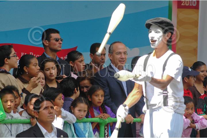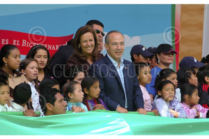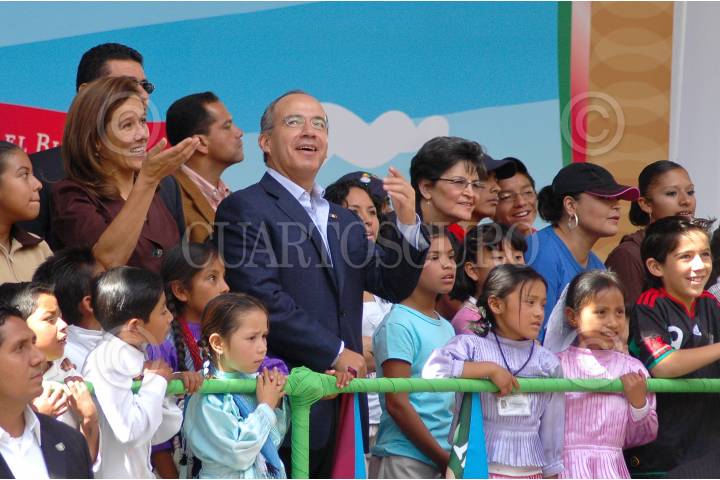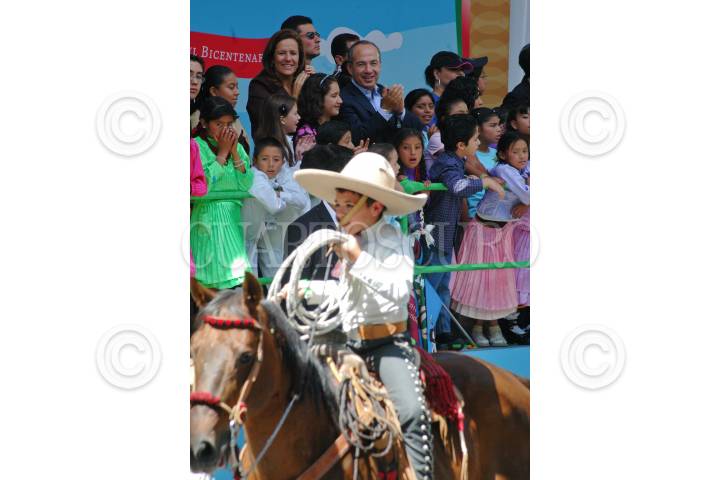 MÉXICO, D.F., 25ABRIL2010.- El presidente Felipe Calderón acompañado de su esposa Margarita Zavala y de sus hijos Maria, Juan Pablo y Luis Felipe observan el Desfile Infantil Niños por el Bicentenario que se realizo sobre el Paseo de la Reforma desde el Circuito Gandhi hasta la glorieta de Colon. FOTO: RODOLFO ANGULO/CUARTOSCURO.COM