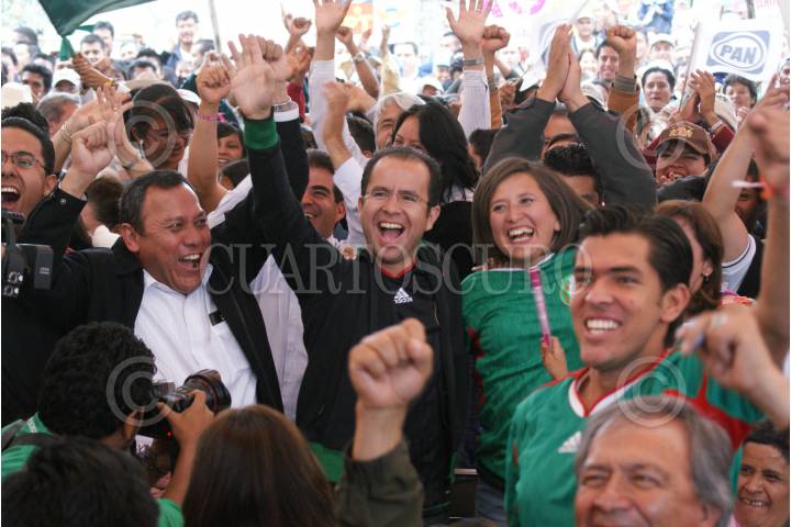 PACHUCA, HIDALGO, 17JUNIO2010.- Xochitl Gálvez, candidata panista a la gubernatura y César Nava, dirigente nacional blanquiazul, observaron y festejaron la victoria de la Selección Mexicana ante su similar de Francia 2-0 en el mundial de Sudáfrica 2010. FOTO: CUARTOSCURO.COM