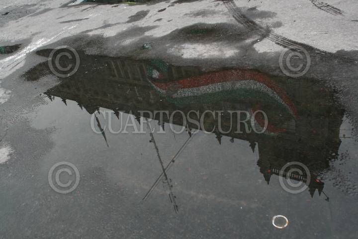 MÉXICO, D.F., 11SEPTIEMBRE2009.- Reflejo de Palacio de Ayuntamiento en un charco ocasionado por las fuertes lluvias. FOTO: SÁSHENKA GUTIÉRREZ/CUARTOSCURO.COM