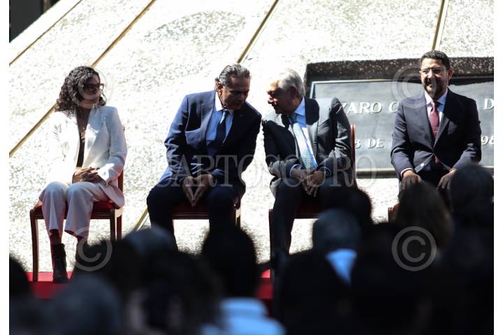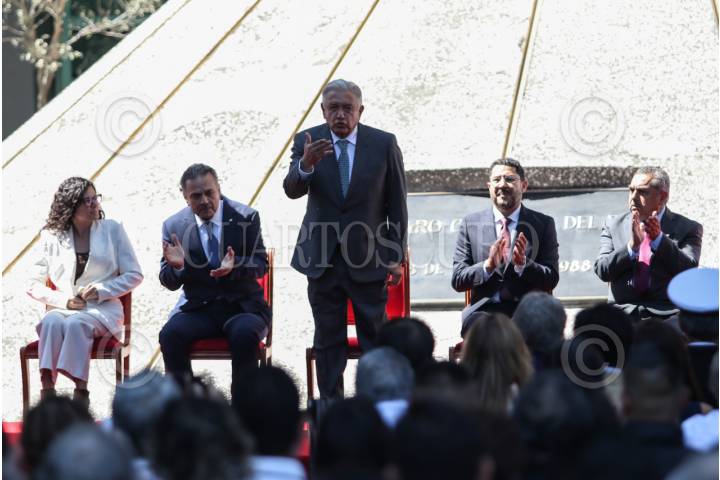 CIUDAD DE MÉXICO, 18MARZO2024.- Andrés Manuel López Obrador, presidente de México acompañado de Luisa María Alcalde, secretaria de gobernación; Octavio Romero Oropeza, director de Pemex; Martí Batres Guadarrama, jefe de gobierno de la Ciudad de México durante el 86 aniversario de la expropiación petrolera. FOTO: ANDREA MURCIA /CUARTOSCURO.COM