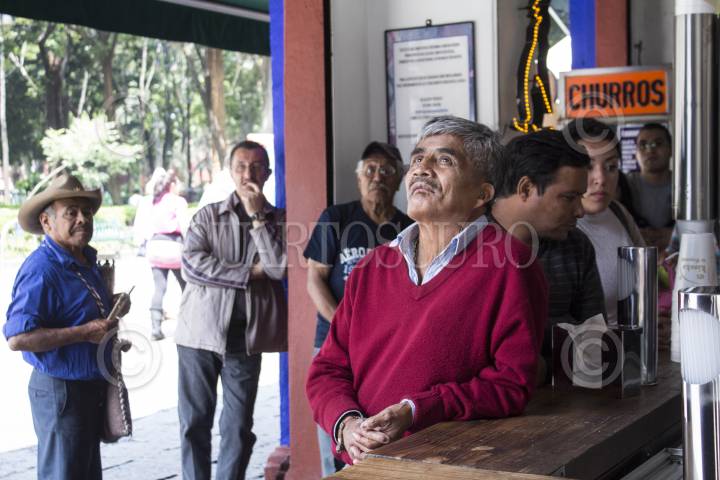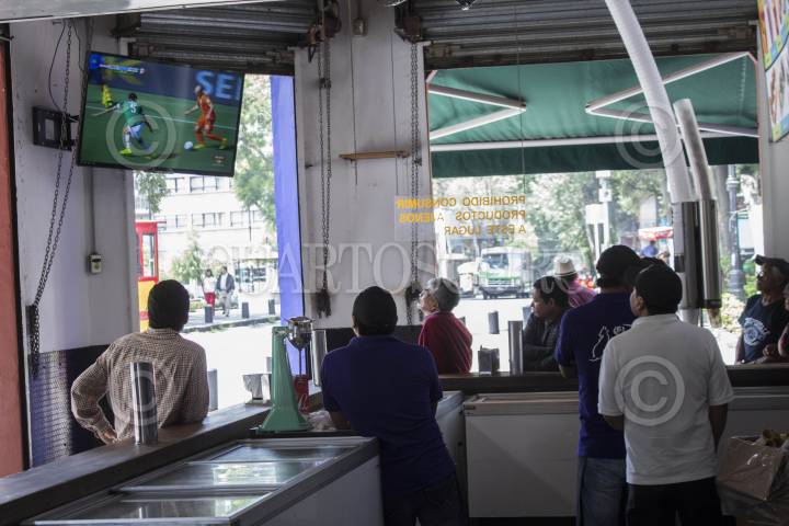 MEXICO, D.F., 29JUNIO2014.- Capitalinos se dieron cita en diferentes restaurantes y cafés de la ciudad para disfrutar el encuentro entre la selección mexicana y la holandesa de fútbol. En la imagen, aficionados miran el partido desde una nevería en Coyoacán. FOTO: DAVID POLO /CUARTOSCURO.COM