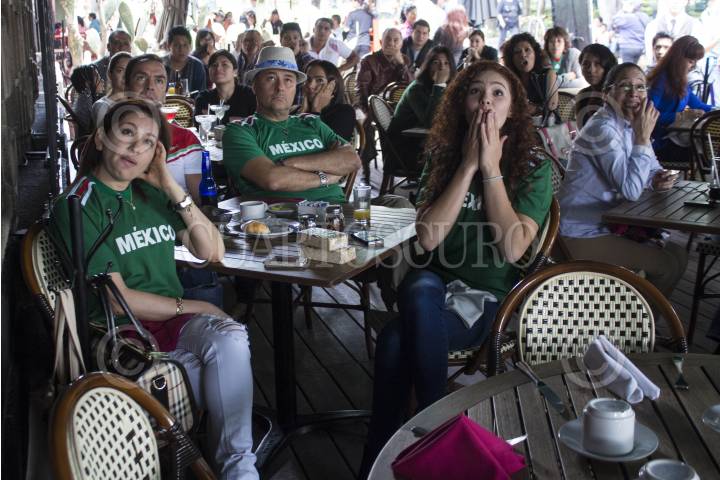 MEXICO, D.F., 29JUNIO2014.- Capitalinos se dieron cita en diferentes restaurantes y cafés de la ciudad para disfrutar el encuentro entre la selección mexicana y la holandesa de fútbol. En la imagen, gestos de los espectadores durante el partido. FOTO: DAVID POLO /CUARTOSCURO.COM