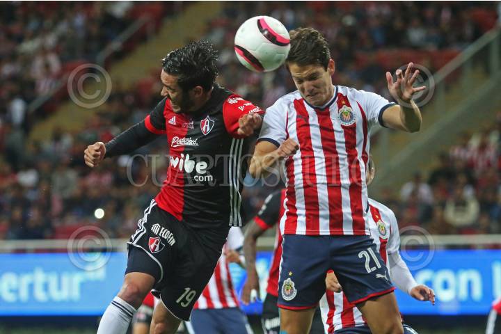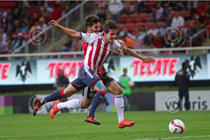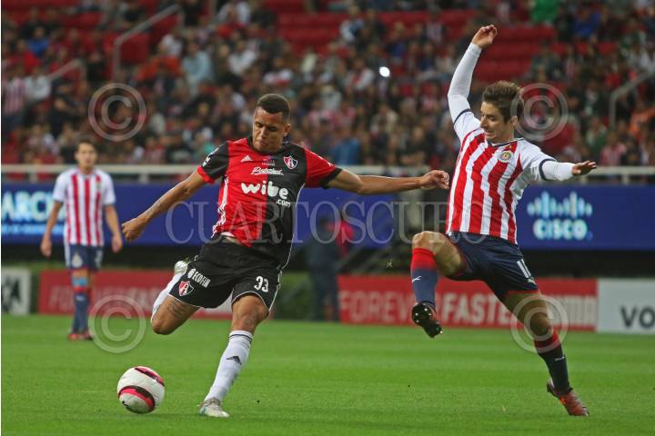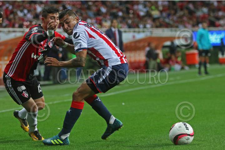 ZAPOPAN, JALISCO. 25OCTUBRE2017.- Juan Pablo Vigon jugador de Atlas disputa un balón a Carlos Fierro de Chivas, esto en partido correspondiente a los Octavos de Final del Torneo Apertura 2017 de la Copa MX, en donde se enfrentan los equipos de la Chivas de Guadalajara frente a los Zorros del Atlas en el Estadio Chivas. FOTO: FERNANDO CARRANZA GARCIA / CUARTOSCURO.COM