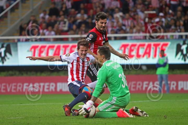 ZAPOPAN, JALISCO. 25OCTUBRE2017.- Carlos Fierro jugador de Chivas disputa un balón a Miguel Fraga y Facundo Erpen de Atlas, esto en partido correspondiente a los Octavos de Final del Torneo Apertura 2017 de la Copa MX, en donde se enfrentan los equipos de la Chivas de Guadalajara frente a los Zorros del Atlas en el Estadio Chivas. FOTO: FERNANDO CARRANZA GARCIA / CUARTOSCURO.COM