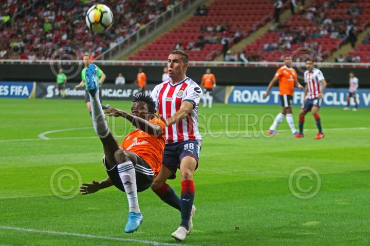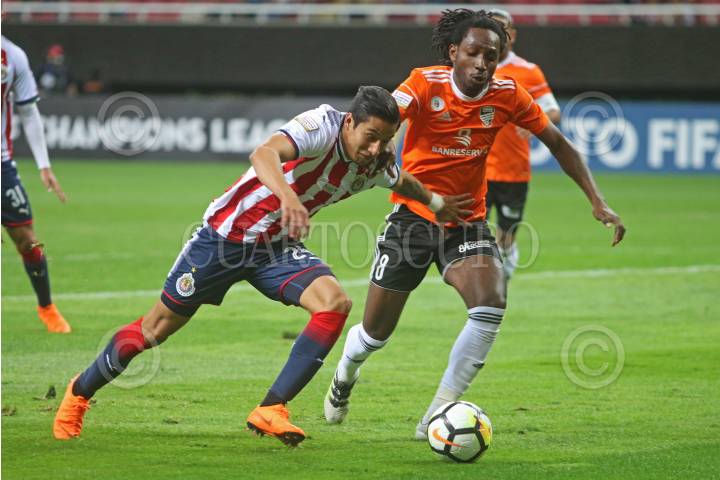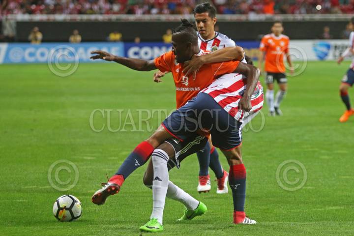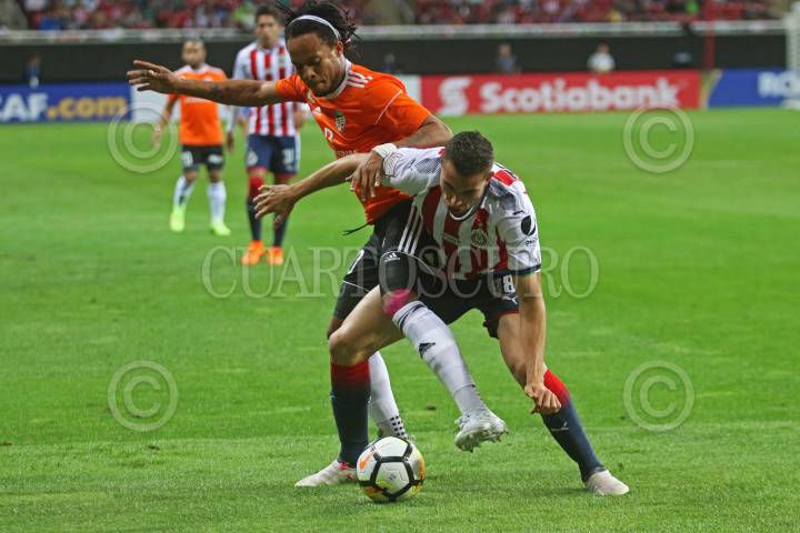 ZAPOPAN, JALISCO, 28FEBRERO2018.- Las Chivas de Guadalajara (México) se enfrentan al Cibao (Republica Dominicana) en el Estadio Akron, en partido correspondiente a los Octavos de Final de vuelta de la Liga de Campeones de la Concacaf. En la imagen Carlos Cisneros jugador de Chivas disputa un balón a Paulson Pierre de Cibao. FOTO: FERNANDO CARRANZA GARCIA / CUARTOSCURO.COM