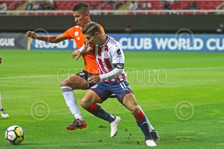 ZAPOPAN, JALISCO, 28FEBRERO2018.- Las Chivas de Guadalajara (México) se enfrentan al Cibao (Republica Dominicana) en el Estadio Akron, en partido correspondiente a los Octavos de Final de vuelta de la Liga de Campeones de la Concacaf. En la imagen Isaac Brizuela jugador de Chivas disputa un balón a Richard Dabas de Cibao. FOTO: FERNANDO CARRANZA GARCIA / CUARTOSCURO.COM