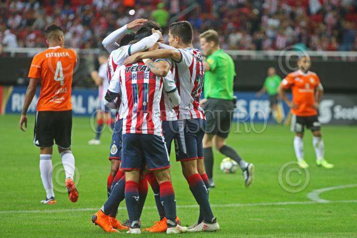 ZAPOPAN, JALISCO, 28FEBRERO2018.- Las Chivas de Guadalajara (México) se enfrentan al Cibao (Republica Dominicana) en el Estadio Akron, en partido correspondiente a los Octavos de Final de vuelta de la Liga de Campeones de la Concacaf. En la imagen jugadores de Chivas celebran la segunda anotación del juego. FOTO: FERNANDO CARRANZA GARCIA / CUARTOSCURO.COM