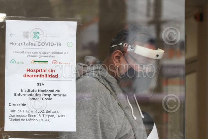Con cartel de saturación hospitalaria un hombre sale del área de urgencias del INER. FOTO: ROGELIO MORALES /CUARTOSCURO.COM