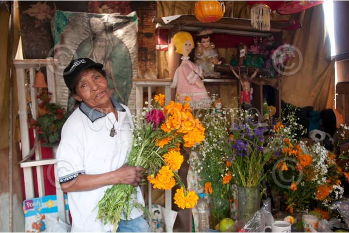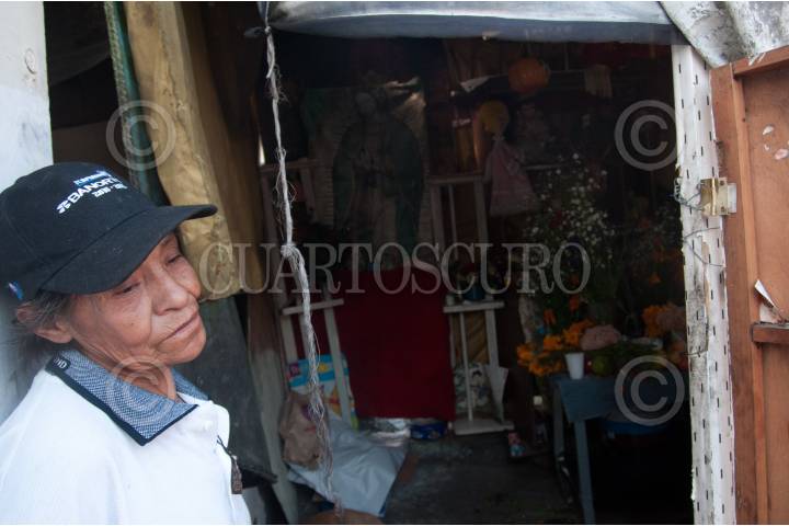 MÉXICO, D.F., 02NOVIEMBRE2011.- En el predio de Chihuahua núm. 95 habita desde hace 12 años, doña Heberta Cortes, Castillo quien es franelera y junto con otras familas ocupa el predio abandonado desde los sismos de 1985 en busca de la expropiación y vivienda digna. Doña Berta quien nació en el municipio de Tula Calnale Hidalgo quedó huerfana a los 4 años y a los 7 migró a la ciudad de México. Por esta razón Doña Berta no tiene cementerio alguno donde ir a dejarle flores a su madre Francisca Cortes Castillo y hermanos y cada año pone una ofrenda en su honor. FOTO: FRANCISCO RODRÍGUEZ/CUARTOSCURO.COM