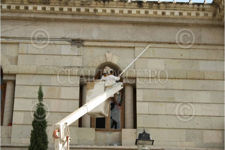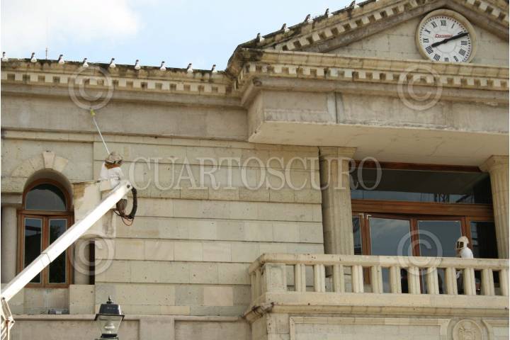 CHILPANCINGO, GUERRERO 11ENERO2009.- Trabajos de exterminio que llevaron a cabo personal de Servicios Publicos Municipales contra el enjambre de abejas africanas que aun continuaban en la fachada del Palacio Municipal este domingo, esto con la finalidad de evitar algun nuevo ataque contra personas que pasan diariamente por el zocalo de la capital del estado como el ocurrido la semana pasada. FOTO: OSCAR ALVARADO/CUARTOSCURO.COM