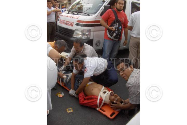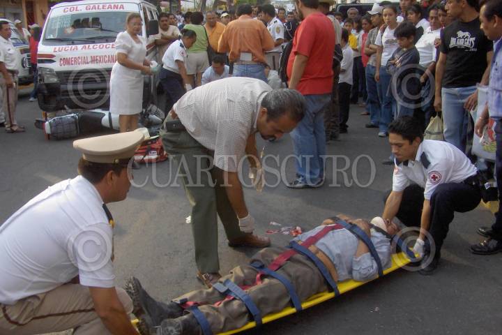 CHIPANCINGO, GUERRERO 03MAYO2006.- Aspecto general del accidente ocurrido sobre la esquina de las calles Galeana y Juarez en el primer cuadro de la ciudad, donde dos personas fueron atropelladas por una combi del servicio publico de transporte, ayer. FOTO: Oscar Alvarado/CUARTOSCURO.COM