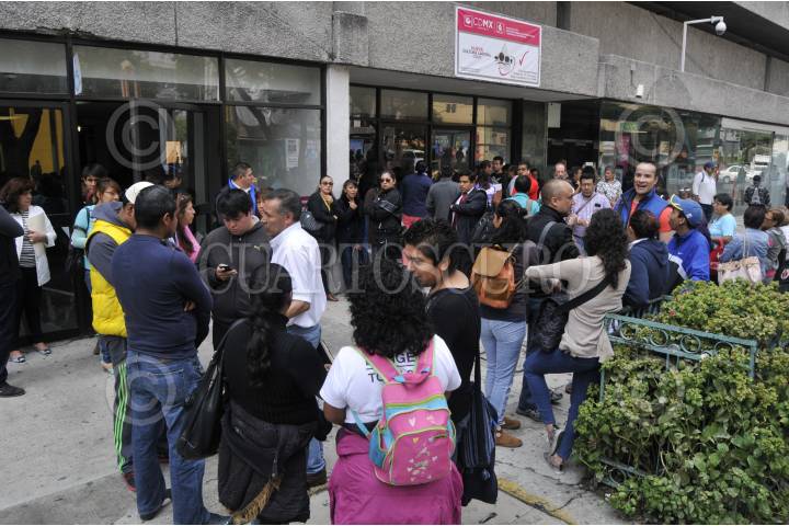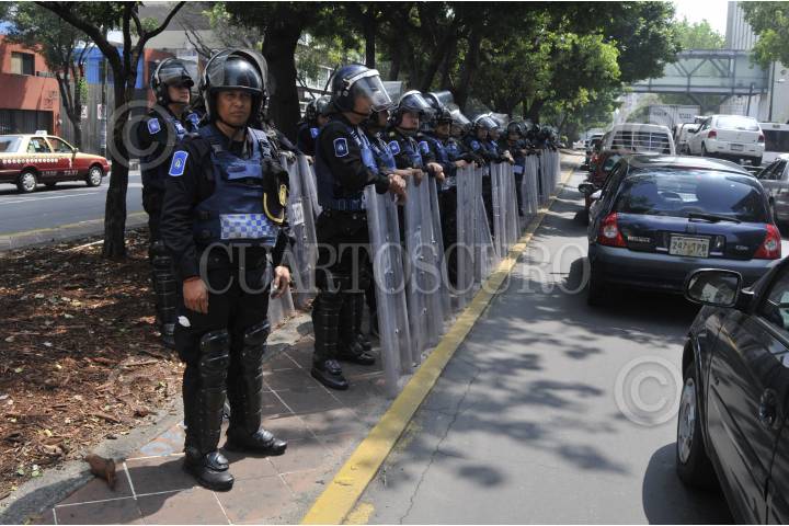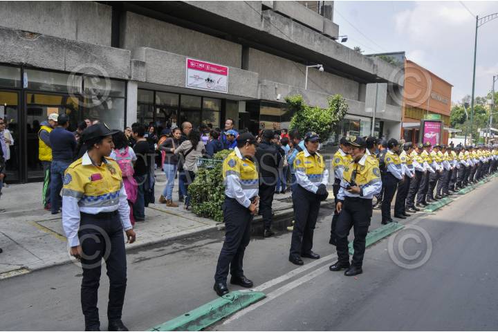 MÉXICO, D.F., 18SEPTIEMBRE2015.- Trabajadores del área de deportes de la delegación Tlalpan, protestaron frente a las instalaciones de la Oficialía Mayor para exigir el pago de su salario de tres meses. Policías antimotines resguardaron las oficinas para evitar que los inconformes bloquearan la vialidad. FOTO: SAÚL LÓPEZ /CUARTOSCURO.COM