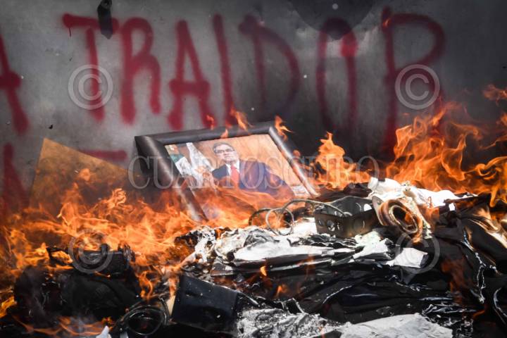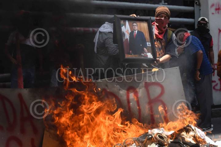 CIUDAD DE MÉXICO, 05JUNIO2025.- Maestros de la Coordinadora Estatal de Trabajadores de Educación de Guerrero (CETEG) irrumpieron la sede del Sindicato Nacional de Trabajadores de la Educación (SNTE) ubicada en República de Venezuela número 44, en donde quemaron diversos objetos y mobiliario de las oficinas, esto en el marco las protestas que el magisterio ha realizado en exigencia de la abrogación de la ley del ISSSTE de 2007. En la imagen, la CETEG, lanzó al fuego un cuadro con el retrato de Alfonso Cepeda Salas, dirigente de la SNTE. FOTO: MARIO JASSO/CUARTOSCURO.COM