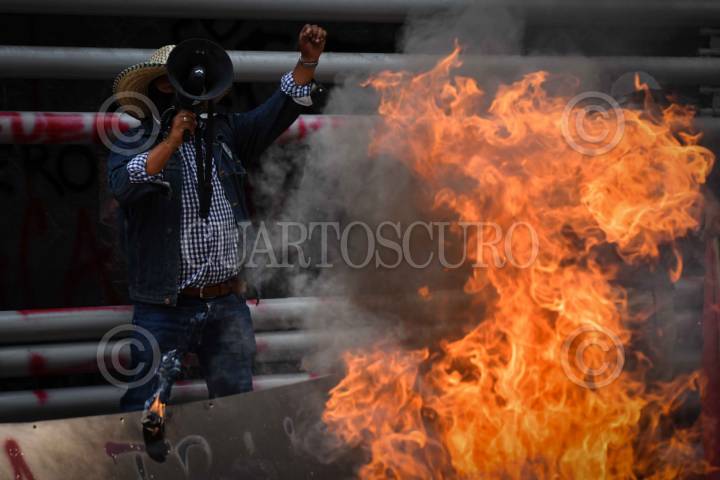 CIUDAD DE MÉXICO, 05JUNIO2025.- Una fogata de gorras y muebles afuera de las oficinas del Sindicato Nacional de Trabajadores de la Educación (SNTE), el cual fue ocasionado por un grupo de maestros de la Coordinadora Estatal de Trabajadores de la Educación de Guerrero (CETEG) exigiendo un diálogo con Claudia Sheinbaum, presidenta de México, sobre la abrogación a la ley del ISSSTE del 2007. FOTO: GRACIELA LÓPEZ/CUARTOSCURO.COM