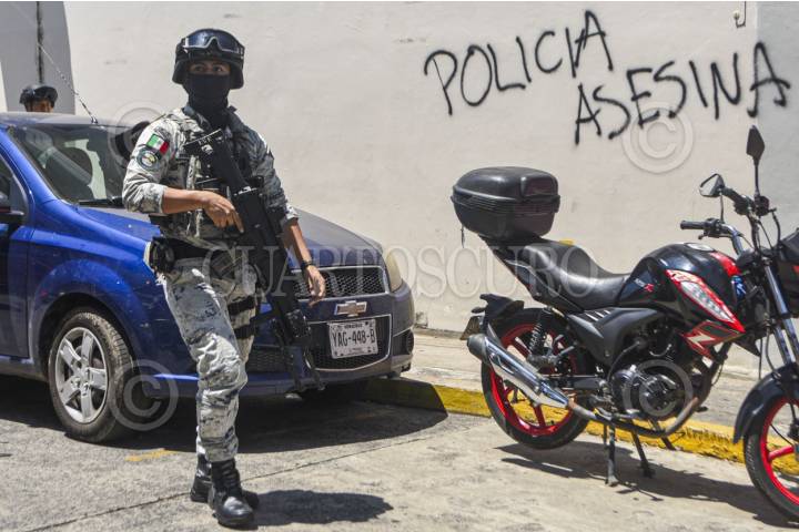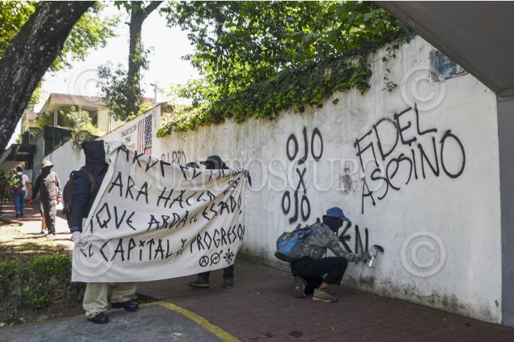XALAPA, VERACRUZ, 15MAYO2025.- Encapuchados vandalizaron las instalaciones del INE en Xalapa en protesta a los diversos homenajes que han realizado en memoria de Fidel Herrera, ex gobernador de Veracruz, quien murió hace un par de semana. Elementos de la Guardia Nacional dispersaron a los manifestantes ya que en las oficinas del instituto se encuentra la papelería electoral para la elección del Poder Judicial. El contingente tras abandonar las oficinas del INE se dirigió a las instalaciones del PRI, en donde también hicieron actos vandálicos. Algunos de los inconformes llevaron retratos del fotoperiodista Rubén Espinosa, quien fue asesinado en circunstancias que jamás han sido aclaradas. FOTO: YERANIA ROLÓN/CUARTOSCURO.COM