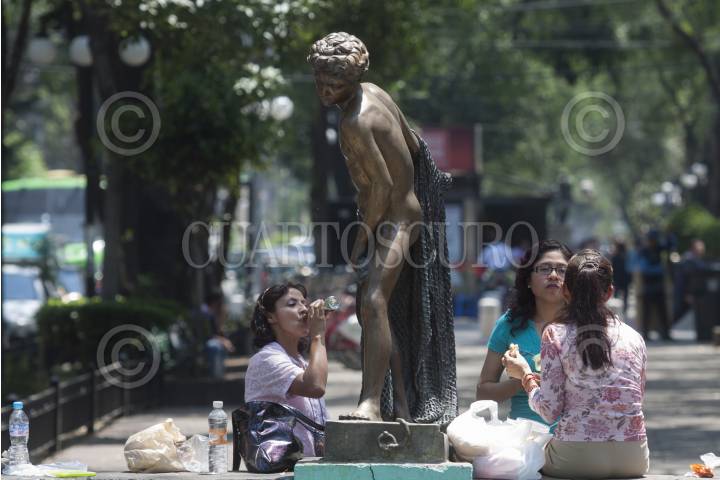 MÉXICO, D.F., 21ABRIL2015.- Mujeres oficinistas toman su almuerzo en los camellones de Álvaro Obregón en compañía de las esculturas típicas de este corredor cultural de la colonia Roma. FOTO: MOISÉS PABLO /CUARTOSCURO.COM