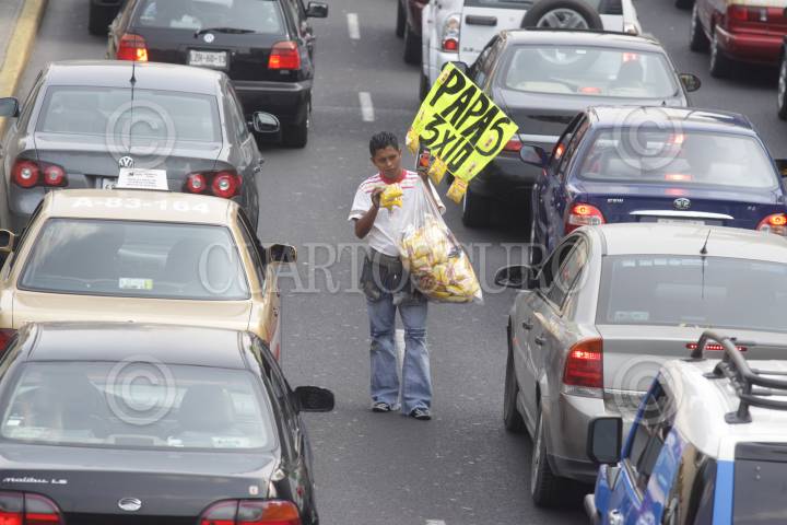 MÉXICO D.F., 12DICIEMBRE2009.- Un vendedor ambulante ofrece sus productos en medio del tráfico vehicular. FOTO: SÁSHENKA GUTIÉRREZ/CUARTOSCURO.COM
