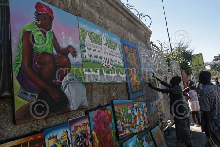 DELMAS, HAITI, 29ENERO2010.- Un artista callejero ofrece sus pinturas sobre la calle de Delmas 33, en un intento por ganar dinero. FOTO: ISAAC ESQUIVEL/CUARTOSCURO.COM