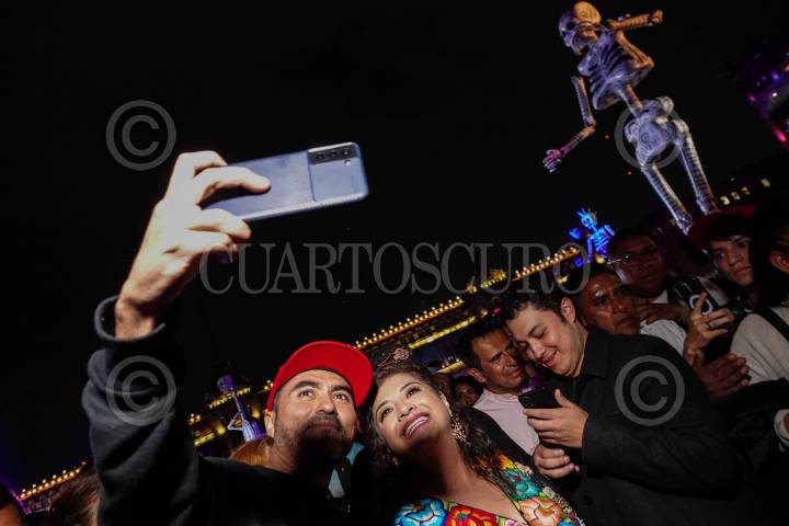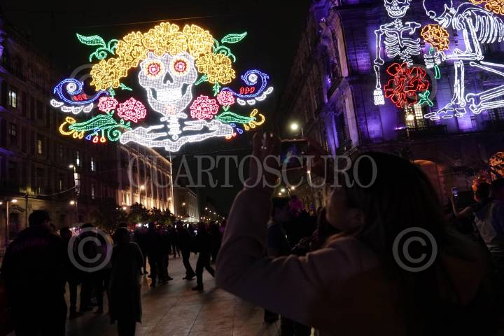 CIUDAD DE MÉXICO, 30OCTUBRE2024.- Capitalinos disfrutan de la Mega Ofrenda Monumental recién inaugurada por la Jefa de Gobierno de la Ciudad de México, Clara Brugada, en la Plancha del Zócalo capitalino. Consta de 21 piezas de cartonería monumental que van de los seis a los diez pies de altura. FOTO: GALO CAÑAS/CUARTOSCURO.COM
