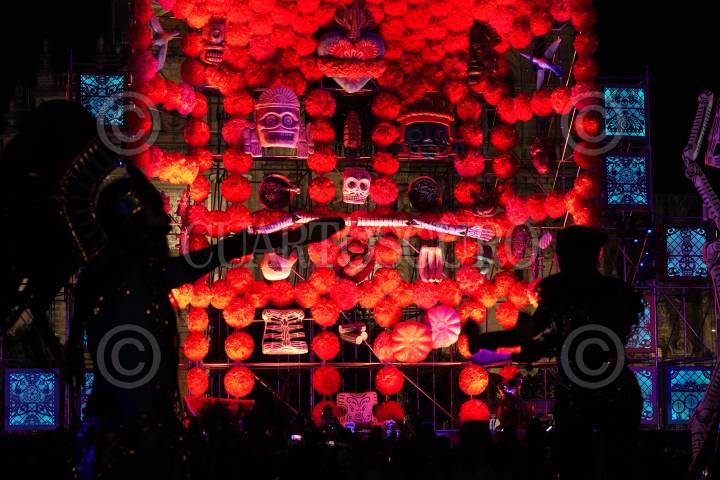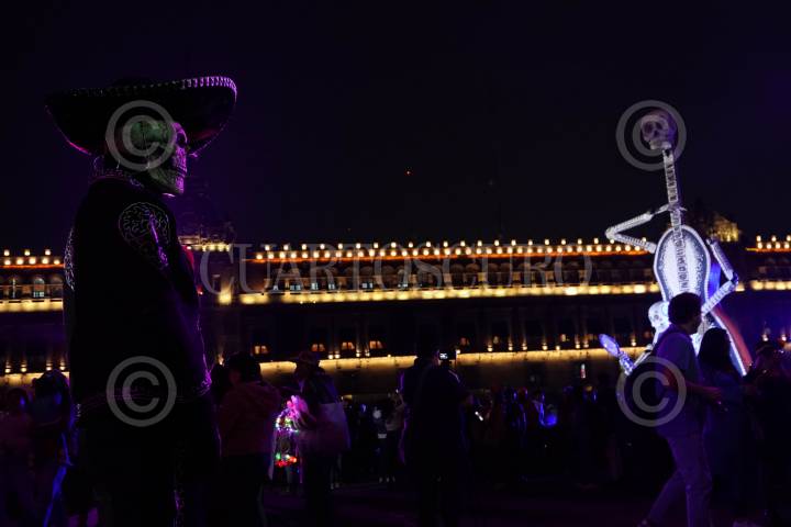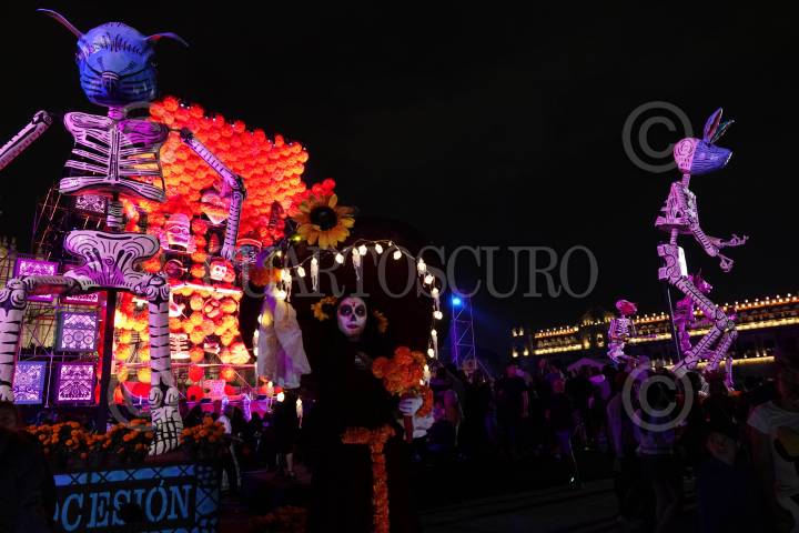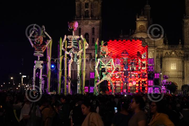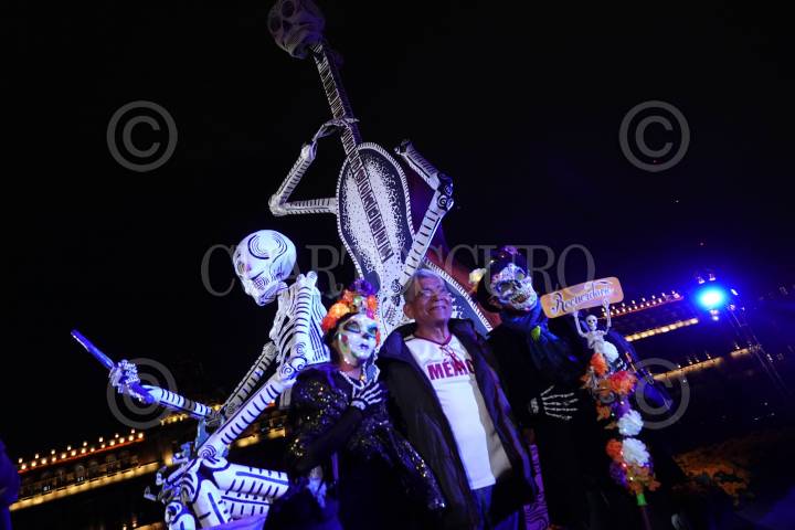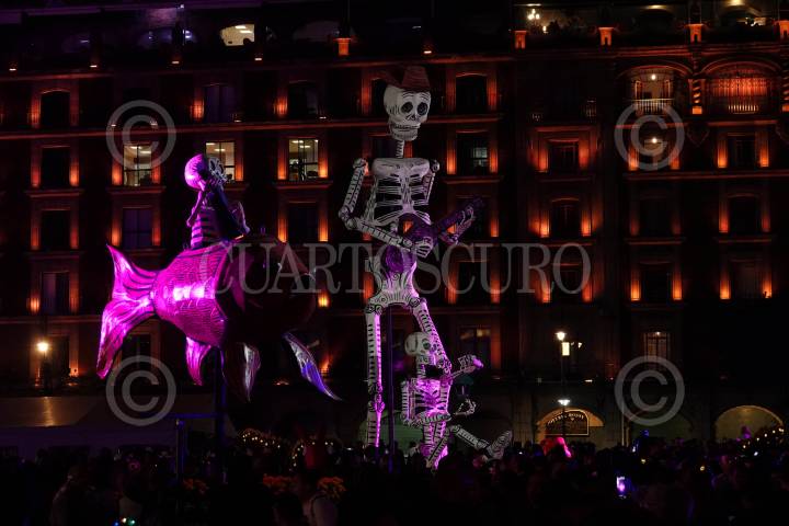 CIUDAD DE MÉXICO, 30OCTUBRE2024.- Clara Brugada, jefa de Gobierno de la Ciudad de México, encabezó la inauguración de la Mega Ofrenda Monumental en la Plancha del Zócalo capitalino. Consta de 21 piezas de cartonería monumental que van de los seis a los diez pies de altura. FOTO: GALO CAÑAS/CUARTOSCURO.COM