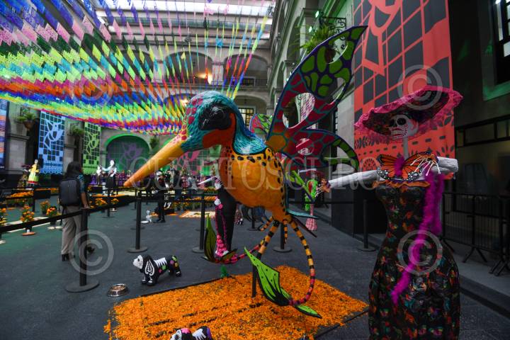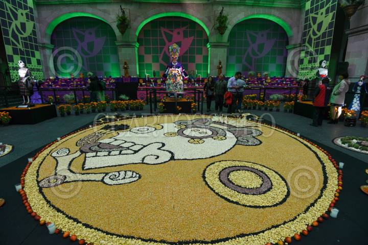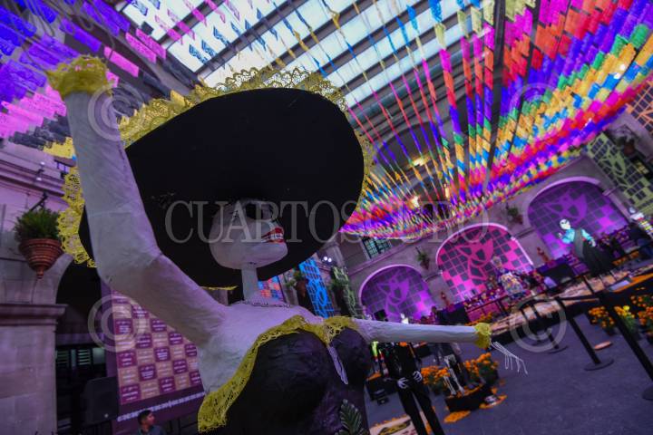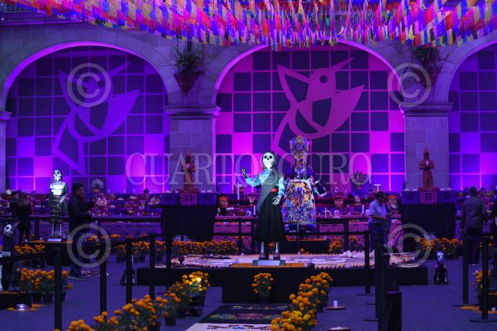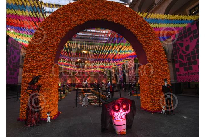TOLUCA, ESTADO DE MÉXICO, 31OCTUBRE2023.- En el marco de la celebración del Día de Muertos en Palacio de Gobierno del Estado de México fue instalada una Ofrenda Monumental en el Patio Central la cual está abierta a la población para que puedan visitarla, la cual estará hasta el 7 de noviembre; integra elementos como tapetes de aserrín, catrinas que representan los pueblos originarios de la entidad, arco de cempasúchil, comida, mascotas de Cartoneria, entre otros. FOTO: CRISANTA ESPINOSA AGUILAR /CUARTOSCURO.COM