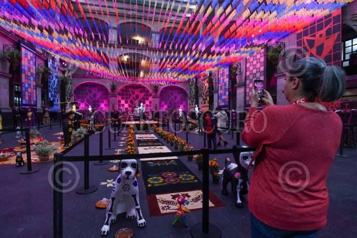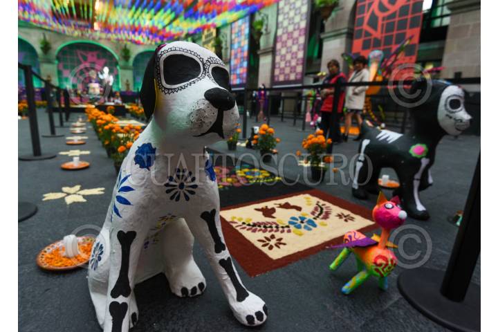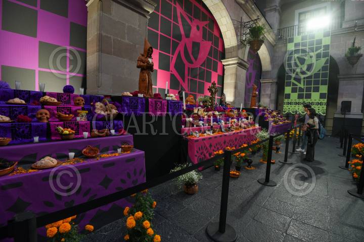 TOLUCA, ESTADO DE MÉXICO, 29OCTUBRE2024.- Instalan ofrenda Monumental en Palacio de Gobierno, en esta ocasión la instalación rinde un homenaje a las diferentes etnias del Estado de México como la Matlazinca, Otomí, Mazahua, Tlahuica y Nahua, también a las mascotas, perros y gatos y buscando rescatar y preservar nuestras raíces prehispánicas, estará abierta al público del 28 de octubre al 4 de noviembre. FOTO: CRISANTA ESPINOSA AGUILAR /CUARTOSCURO.COM