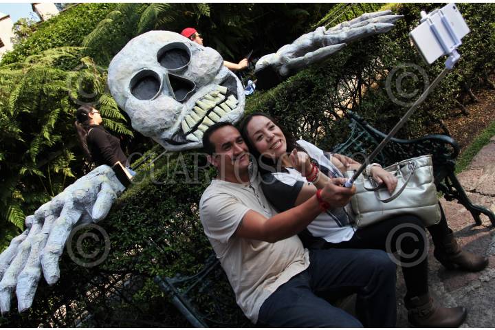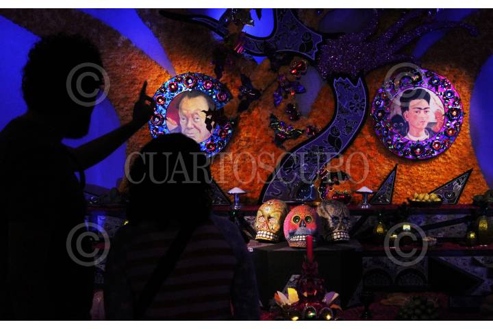 CIUDAD DE MÉXICO, 01NOVIEMBRE2016.- Rodeados por catrinas, calaveras y cempasúchitl centenas de vivistantes acudieron a la tradicional ofrenda de Día de Muertos en el Museo Dolores Oliendo, la cual permanecerá abierta al público hasta los últimos días de diciembre. Este año la ofrenda está dedicada a los artistas plásticos Diego Rivera y Frida Kahlo. Mañana se realizará el concurso de catrinas, uno de los más populares durante estas festividades. FOTO: MARÍA JOSÉ MARTÍNEZ /CUARTOSCURO.COM
