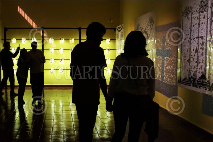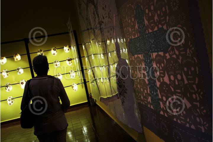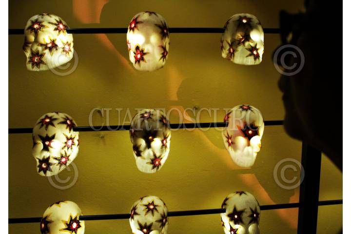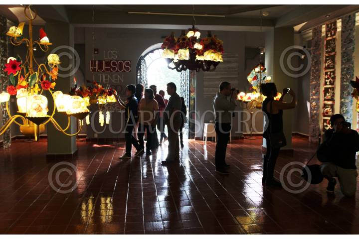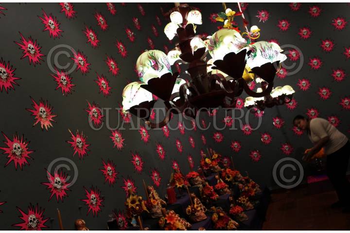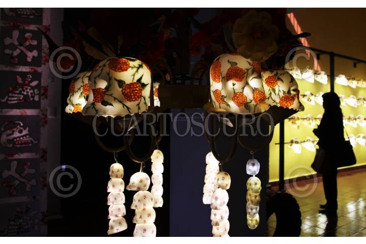 CIUDAD DE MÉXICO, 01NOVIEMBRE2016.- La exposición de la artista Betsabé Romero “Los huesos tienen memoria” fue inaugurada en el Museo Dolores Olmedo. Está conformada por decenas de candelabros armados por calaveras de azúcar y velas de cera, además incluye una instalación audiovisual y murales de vinilo. FOTO: MARÍA JOSÉ MARTÍNEZ /CUARTOSCURO.COM
