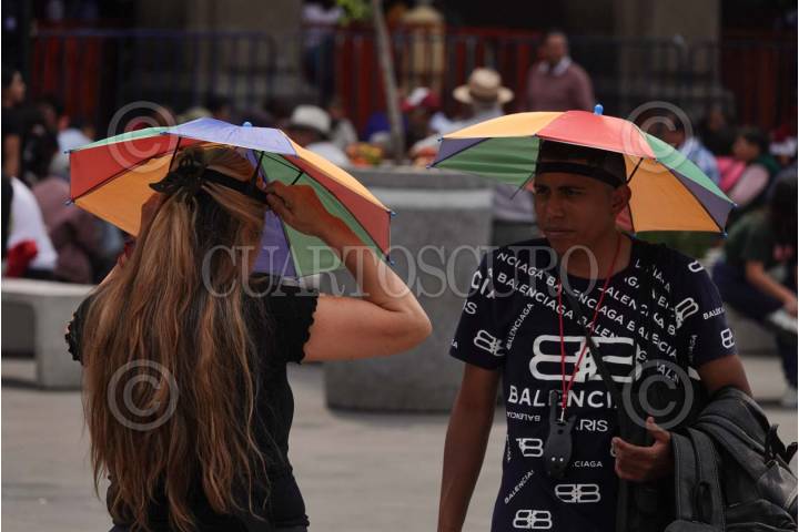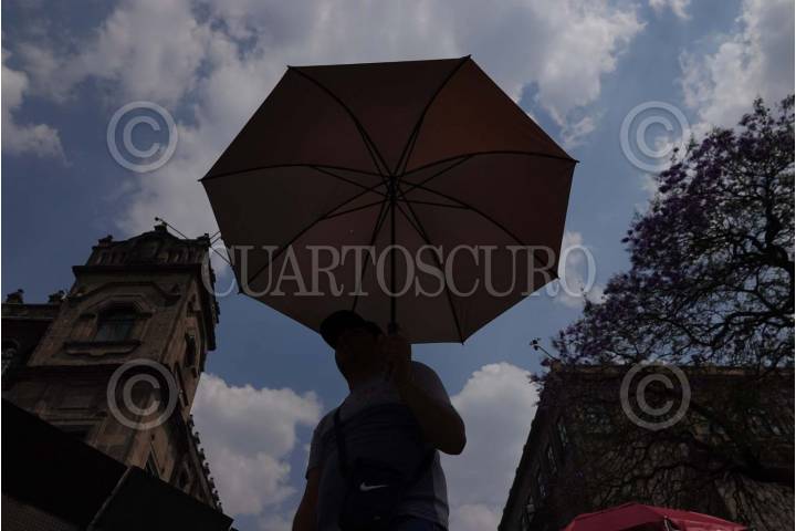 CIUDAD DE MÉXICO, 12ABRILO2025.- Con sombrillas personas se cubren del sol debido a las altas temperaturas que prevalecen en la Ciudad. FOTO: MAGDALENA MONTIEL/CUARTOSCURO.COM