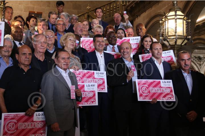 CIUDAD DE MÉXICO, 11OCTUBRE2018.-José Ramón Amieva, jefe de Gobierno de la Ciudad; Horacio de la Vega Flores, director general del Indeporte CDMX; Guillermo Calderón Aguilera, director General de Metrobús; Jimena Saldaña Gutiérrez, 1era vicepresidenta del COM; Eduardo Terrazas, miembro del comité organizador México 68; Jorge J. Jiménez Alcaraz, director general del sistema de transporte Colectivo Metro; Enrique Basilio, la primera mujer en prender un pebetero olímpico; Debbie Meyer, medallista olímpico; Felipe Muñoz Kapamas, medallista Olímpico, oro en natación y Keino Kipchoge, Medallista Olímpico, ofrecieron conferencia de prensa en el antiguo palacio de Gobierno para dar detalles sobre el 50 aniversario de los Juegos Olímpicos de México en 1968. Seguido se realizó la presentación del boleto y tarjeta de metro conmemorativa a los Juegos Olímpicos de aquel año. FOTO: ANDREA MURCIA /CUARTOSCURO.COM