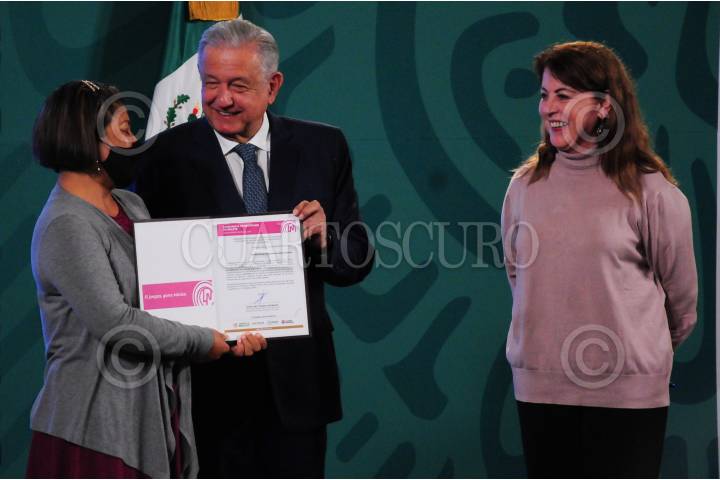 Andrés Manuel López Obrador, presidente de México, escucha la participación de Elizabeth Vilchis, durante la conferencia mañanera.