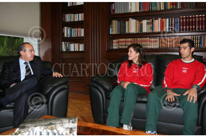 MEXICO D.F.28MAYO2007.-El presidente Felipe Calderon recibió en la residencia oficial de los Pinos a los campeones mundiales de Taekwondo, María Espinoza. Guillermo Perez y Rodolfo Osornio. FOTO: ALFREDO GUERRERO/CUARTOSCURO.COM