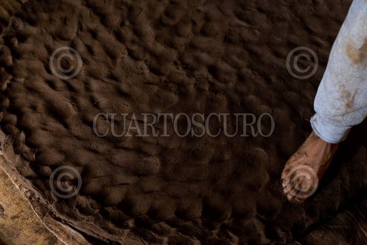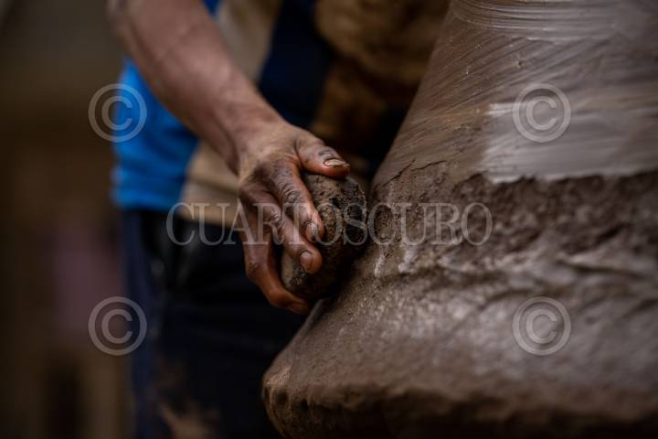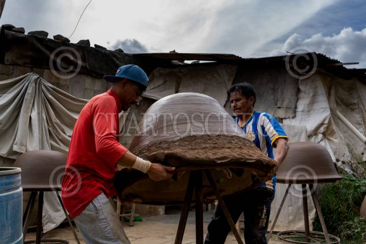 LA TRINIDAD TENEXYECAC, TLAXCALA, 21DICIEMBRE2024.- En la comunidad de La Trinidad, alrededor de 120 familias continúan el legado alfarero que las generaciones han heredado. Este es el caso de Álvaro Vázquez quien aprendió de su padre el oficio y ya acumula 40 años de experiencia en la elaboración de moleras, arroceras y figuras de barro de todas formas y tamaños. En la imagen, su sobrino Alexis aplana el barro que será modelado para una olla molera de gran tamaño. FOTO: GALO CAÑAS/CUARTOSCURO.COM