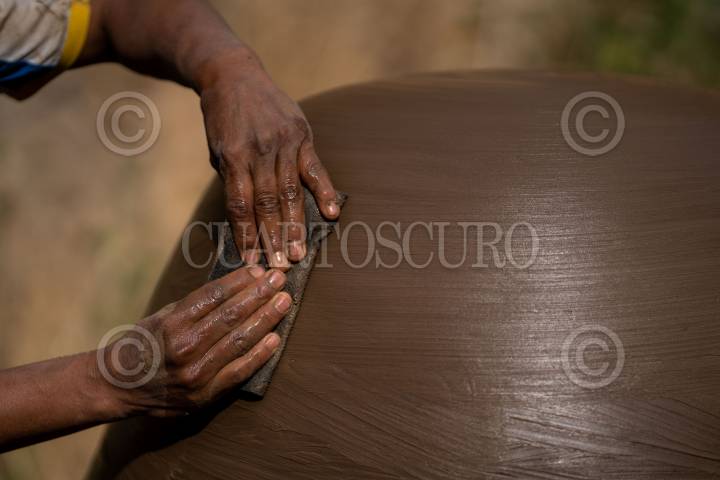 LA TRINIDAD TENEXYECAC, TLAXCALA, 21DICIEMBRE2024.- En la comunidad de La Trinidad, alrededor de 120 familias continúan el legado alfarero que las generaciones han heredado. Este es el caso de Álvaro Vázquez quien aprendió de su padre el oficio y ya acumula 40 años de experiencia en la elaboración de moleras, arroceras y figuras de barro de todas formas y tamaños. En la imagen, el maestro alfarero Álvaro Vázquez colocar las llamadas “orejas” de las ollas moleras que se encuentran secando en su taller. FOTO: GALO CAÑAS/CUARTOSCURO.COM