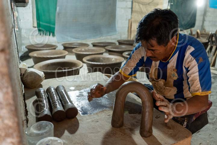 LA TRINIDAD TENEXYECAC, TLAXCALA, 21DICIEMBRE2024.- En la comunidad de La Trinidad, alrededor de 120 familias continúan el legado alfarero que las generaciones han heredado. Este es el caso de Álvaro Vázquez quien aprendió de su padre el oficio y ya acumula 40 años de experiencia en la elaboración de moleras, arroceras y figuras de barro de todas formas y tamaños. En la imagen, el maestro alfarero Álvaro Vázquez modela barro para colocar las llamadas “orejas” de las ollas moleras. FOTO: GALO CAÑAS/CUARTOSCURO.COM
