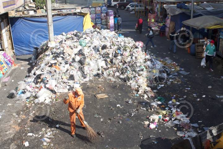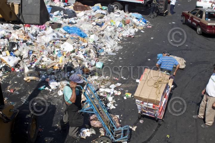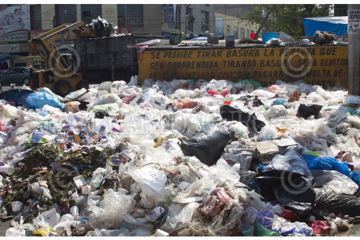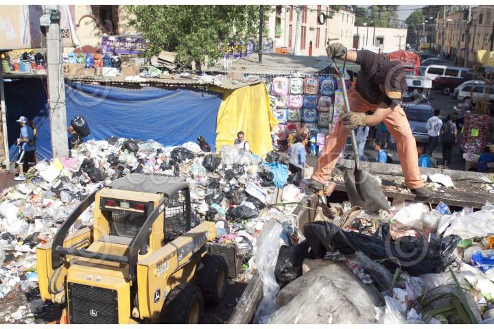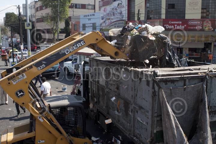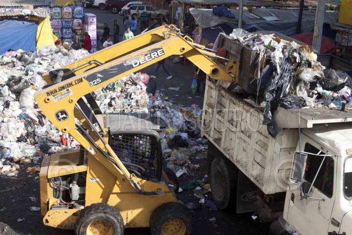 MÉXICO, D.F., 29DICIEMBRE2011.- En el mercado de la merced el tiradero de la basura que se ubica en la calle de San Cifrián ha sido sobrepasado, por lo que trabajadores del Gobierno del DF utilizan un trascabo para llenar camiones de carga y llevarse los desperdicios que se acumularon desde el pasado 24 de diciembre. Aún a pesar de los malos olores que despiden los desechos los marchantes de la merced transportan alimentos y mercancías diversas. FOTO: MOISÉS PABLO/CUARTOSCURO.COM