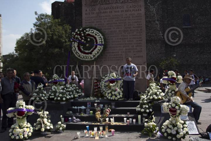 MÉXICO, D.F., 02OCTUBRE2013.- En el Monumento a los asesinados durante la marcha del dos de octubre de 1968 se montó una guardia previo a la marcha conmemorativa a la matanza de jóvenes suscitada cuando el batallón Olimpia mató a quienes participaron en aquel año en un mítin en la Plaza de las Tres Culturas en Tlatelolco. FOTO: IVÁN STEPHENS /CUARTOSCURO.COM