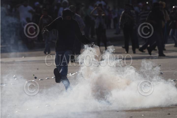 MÉXICO, D.F., 02OCTUBRE2013.- Policías y jóvenes con el rostro cubierto se enfrentaron con golpes, palos y piedras a la altura de Monumento al Caballito en la marcha conmemorativa a la matanza de jóvenes suscitada el 2 de octubre del 1968 cuando el batallón Olimpia asesinó a quienes participaron en aquel año en un mítin en la Plaza de las Tres Culturas en Tlatelolco. FOTO: IVÁN STEPHENS /CUARTOSCURO.COM