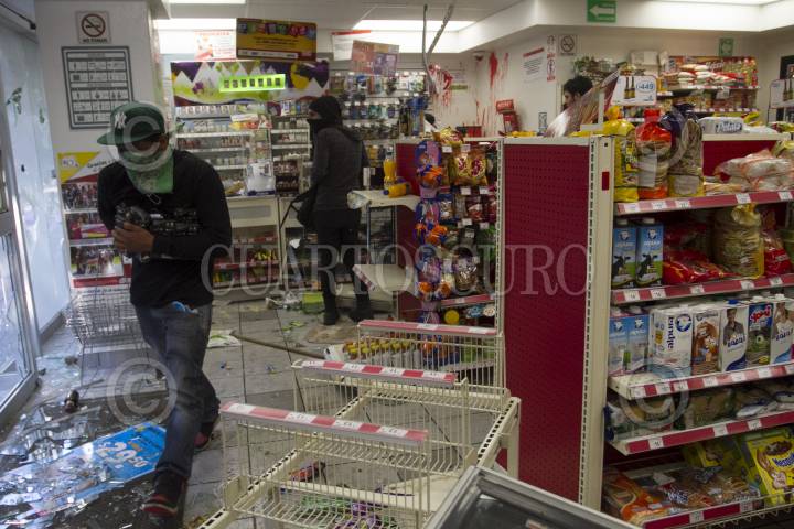 MÉXICO, D.F., 02OCTUBRE2013.- Jóvenes con el rostro cubierto saquearon dos tiendas OXXO ubicadas sobre avenida Reforma casi a la altura de la Glorieta de Colón durante los disturbios que tuvieron lugar en la marcha conmemorativa a la matanza de jóvenes suscitada el 2 de octubre del 1968 cuando el batallón Olimpia asesinó a quienes participaron en aquel año en un mítin en la Plaza de las Tres Culturas en Tlatelolco. FOTO: IVÁN STEPHENS /CUARTOSCURO.COM