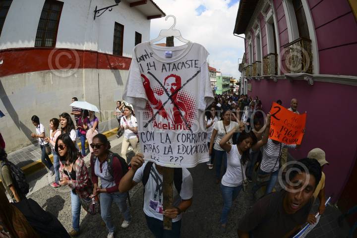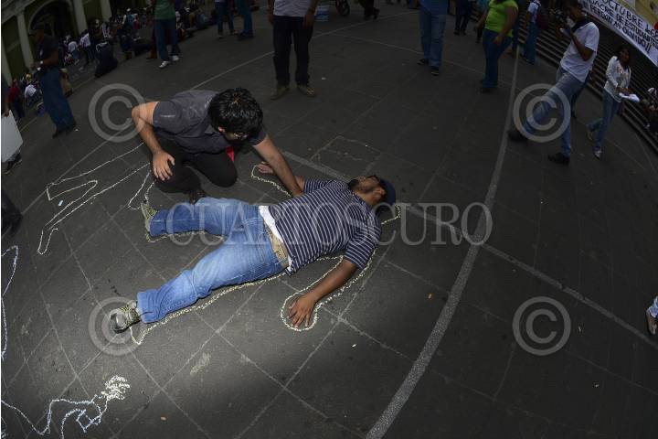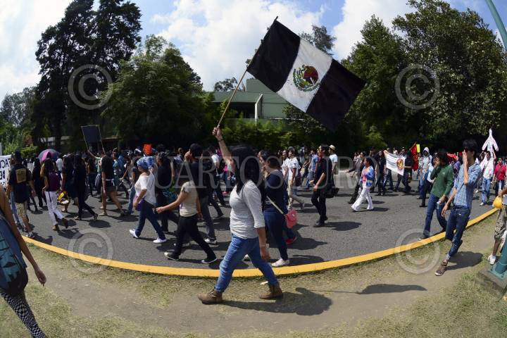 XALAPA, VERACRUZ., 02OCTUBRE2013.- Miles de estudiantes, maestros y ciudadanos marcharon este día por diferentes puntos de la ciudad para conmemorar el 45 aniversario de la matanza de estudiantes en 1968 en Tlatelolco. Los docentes se postraron en la plaza Lerdo mientras los estudiantes encabezados por la unidad de Humanidades de la Universidad Veracruzana recorrieron diferentes facultades de la UV con la intención de integrar a mas estudiantes al contingente para después arribar frente a Palacio de Gobierno en donde realizaron pintas con gis referentes a dicho acontecimiento. FOTO: RUBÉN ESPINOSA / CUARTOSCURO.COM