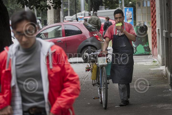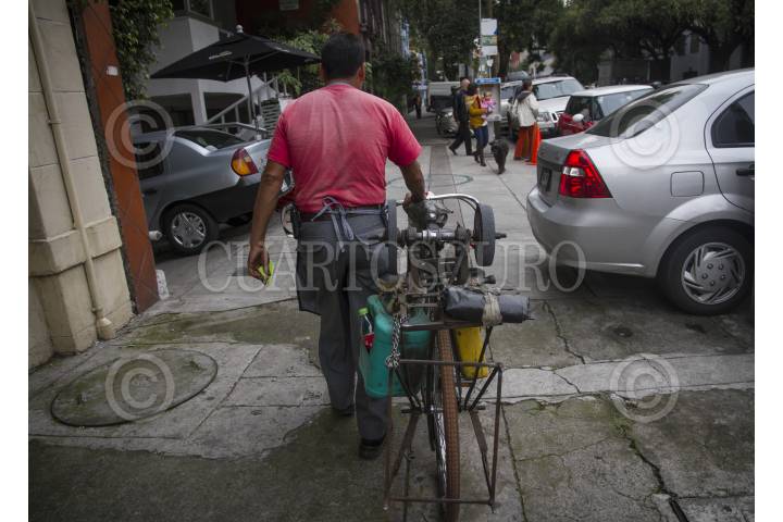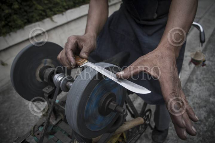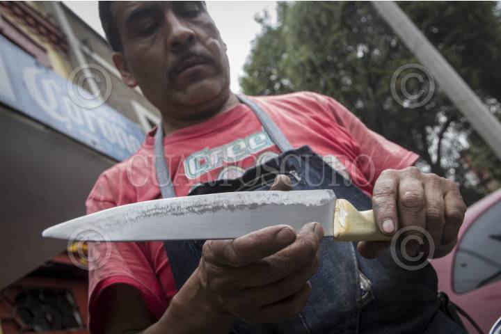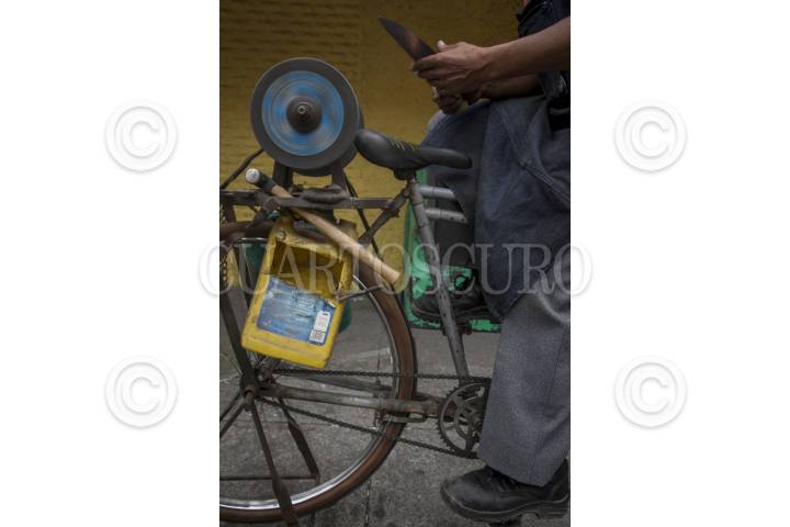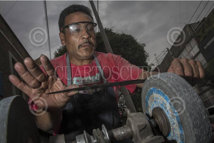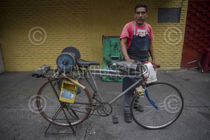 MÉXICO, D.F., 03OCTUBRE2015.- José Espinoza Zamora aprendió el oficio de afilador de uno de sus cuñados y se gana la vida de sacar filo a cuchillos o tijeras desde hace treinta años. Vive en Toluca y diariamente recorre las calles de las colonias Obrera, Roma, Condesa y San Miguel Chapultepec mientras sopla en su flauta de Pan para anunciar sus servicios. Su bicicleta, medio de transporte e instrumento de trabajo, la compró y acondicionó para transportar el mecanismo que hace girar los esmeriles con que afila los objetos cortantes. Don José ya conoce su ruta y sus clientes lo saludan amables; cobra entre diez y veinte pesos, según el cuchillo o el filo que necesite, y en un buen día ofrece sus servicios hasta veinte veces. En su familia, además de su cuñado, tiene dos sobrinos que se dedican a este oficio que tiene siglos de existir y que ha ido desapareciendo ante la implantación de una cultura de lo desechable en nuestra sociedad. FOTO: ISAAC ESQUIVEL /CUARTOSCURO.COM