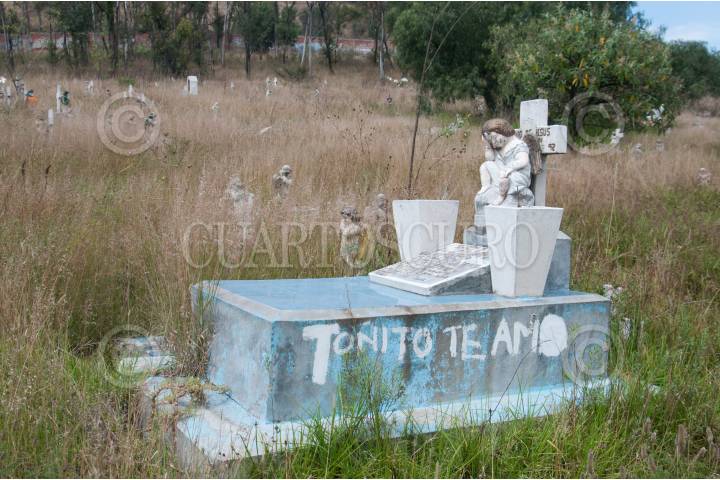 MEXICO, D.F., 02NOVIEMBRE2015.- La zona donde se entierran a los niños en el Panteón Civil de Iztapalapa se encuentra en total abandono, el lugar se encuentra a las orillas del camposanto por lo que mucha gente no visita esa parte, que luce con mucha yerba cubriendo las criptas, en su mayoría con figuras de angelitos, muchos de ellos rotos y tirados por el campo, erosionados por el clima y el tiempo, ya que algunos están ahí desde los años sesenta del siglo pasado. FOTO: DIEGO SIMÓN SÁNCHEZ /CUARTOSCURO.COM