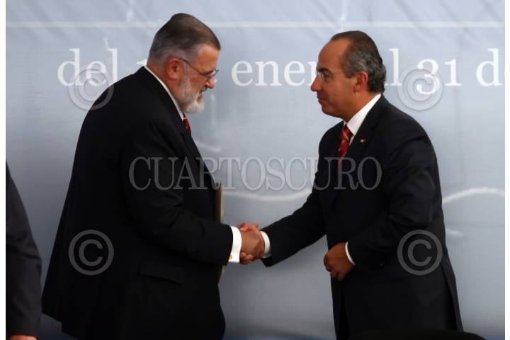 MÉXICO,D,F 15FEREBRO2008.- José Luis Soberanes Presidente de la CNDH el Presidente de los Estados Unidos Mexicanos Felipe Calderon Hinojosa durante el informe de actividades del ombusdman en las instalaciones de la CNDH al sur de la ciudad de México FOTO: SASHENKA GUTIERREZ/CUARTOSCURO.COM