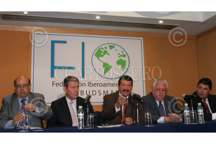 MEXICO, D.F., 27MARZO2008.- Manuel Aguilar, Manuel María Páez, Omar Cabezas Lacayo, presidente del Consejo Rector de la Federación Iberoamericana del Ombusdman, Carlos López y Oscar Humberto Herrera López, realizaron un pronunciamiento en apoyo a la Comisión Nacional de Derechos Humanos de México por la campaña de desprestigio emprendida a nivel internacional por Human Rights Watch en su contra. FOTO: MOISÉS PABLO/CUARTOSCURO.COM