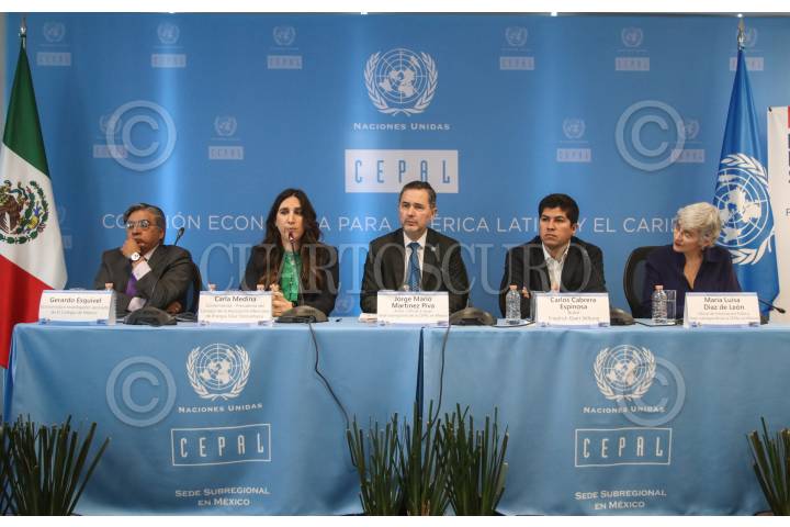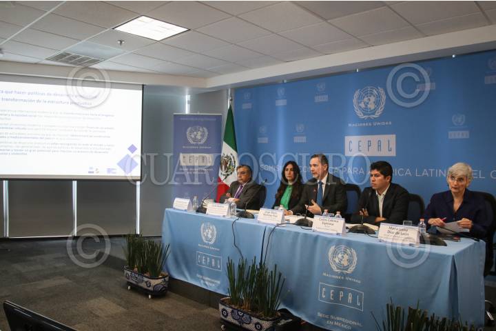 CIUDAD DE MÉXICO, 26JUNIO2024.- Gerardo Esquivel, economista asociado al Colegio de México; Carla Medina, presidenta del consejo de la asociación Mexicana de Energía Solar Fotovoltaica; Jorge Mario Martínez Pivac oficial a cargo sede subregión al de la CEPAL en México; Carlos Cabrera Espinosa, autor Friedrich Ebert Stiftung y María Luisa Díaz de León , oficial de información Pública sede su regional de la CEPAL en México presentaron la publicación de CEPAL y la Fundación Friedrich Ebert (FES) con temas claves para diseñar e implementar una política de desarrollo productivo sostenible en México. FOTO: ANDREA MURCIA /CUARTOSCURO.COM