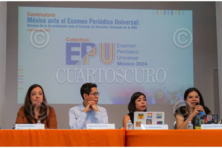 CIUDAD DE MÉXICO, 05JULIO2024.- Diohema Anlleu, directora de la Fundación JUCONI; Eduardo Guerrero, abogado del Área Internacional en Centro Prodh; Zué Valenzuela, abogada defensora de derechos humanos, y Mariana Bermudez, politóloga, feminista y defensora de derechos humanos, presenciaron el conversatorio: “México ante el examen periódico universal: balance de la 4a evaluación ante el Consejo de Derechos Humanos de la ONU”, en el Centro de Derechos Humanos Miguel Agustín. FOTO: ALICE MORITZ/CUARTOSCURO.COM