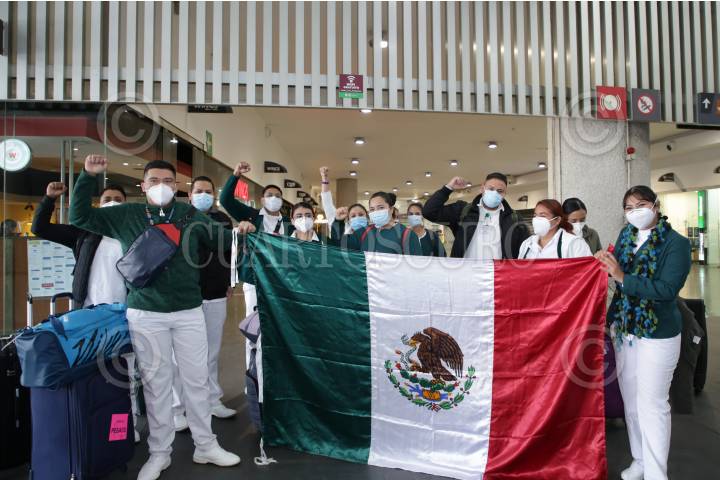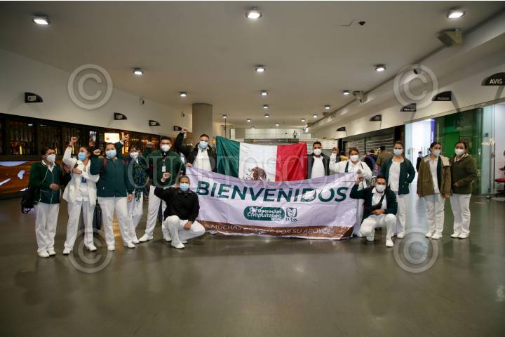 Cuarenta y dos trabajadores del Instituto Mexicano del Seguro Social (IMSS) de Sonora durante su llegada en el Aeropuerto Internacional de la Ciudad de México para sumarse a la "Operación Chapultepec", para reforzar la atención médica durante la pandemia de covid-19.