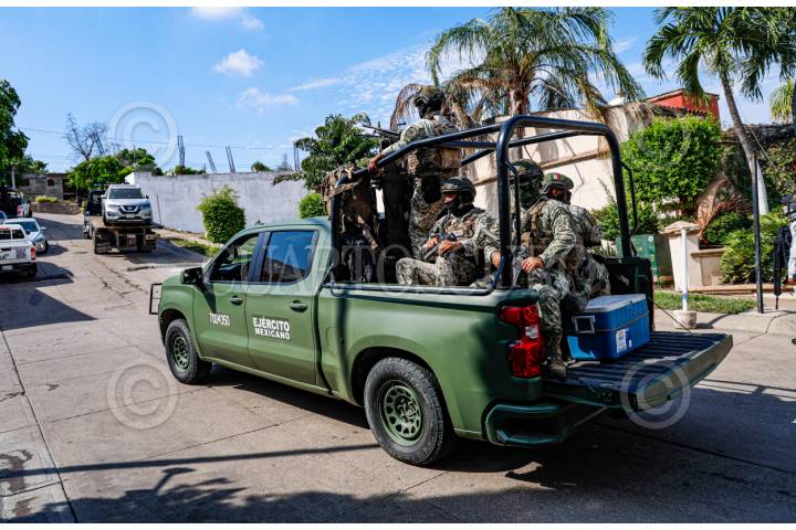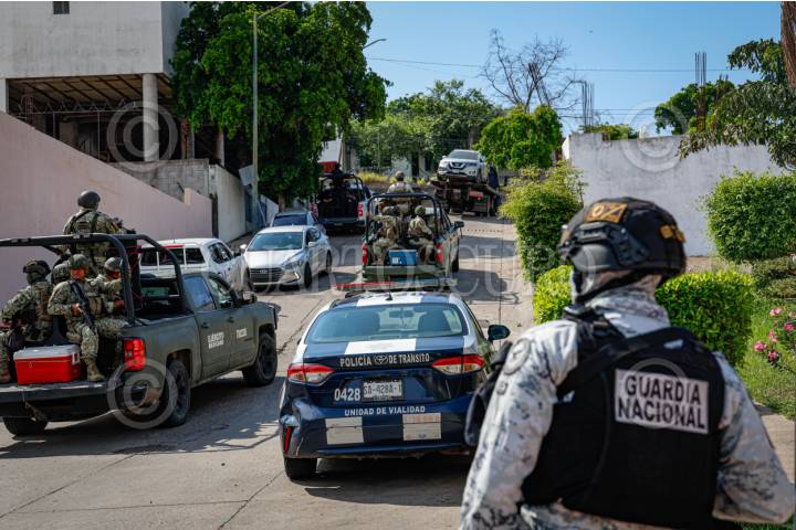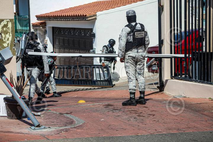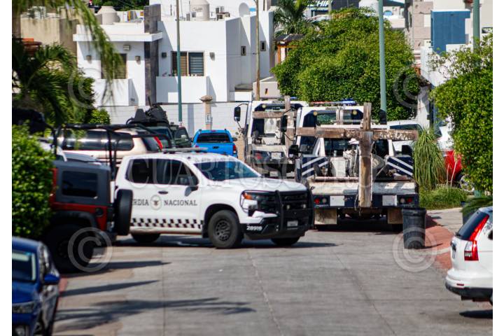 CULIACÁN, SINALOA, 12AGOSTO2025.- Durante un operativo realizado en el fraccionamiento Colinas del Rey, sector Loma Linda, al sur de la ciudad, personal de la Fiscalía General de la República (FGR) y elementos de la Secretaría de la Defensa Nacional aseguraron dos residencias, además de al menos cuatro vehículos, diversas armas y una cantidad no especificada de dinero en efectivo. Aunque las autoridades no han emitido un informe oficial sobre el saldo del operativo, fuentes extraoficiales confirmaron los aseguramientos mientras las diligencias continuaban dentro de las viviendas ubicadas en una zona privada sobre las calles Cerro de la Campana y Cerro de la Noria. Vecinos del lugar alertaron a las autoridades tras observar movimiento militar en el interior del fraccionamiento, el cual presentó daños en el sistema de acceso y un portón derribado, sin que hasta el momento se haya determinado si fueron provocados por fuerzas de seguridad o por integrantes de la delincuencia organizada. Al sitio también acudieron grúas de la policía de tránsito para retirar los vehículos asegurados, así como una plataforma de la Policía Estatal Preventiva que transportaba una camioneta SUV gris, con daños visibles en el parabrisas, presuntamente causados por impactos de arma de fuego, aunque su vínculo con los hechos aún no ha sido esclarecido. FOTO: JOSÉ BETANZOS/CUARTOSCURO.COM